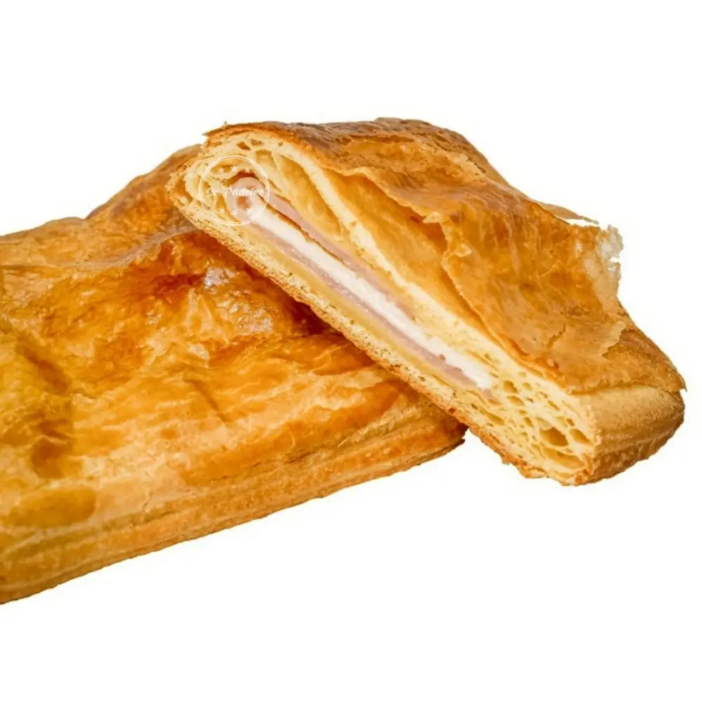 Massa: farinha de TRIGO, açúcar, gordura vegetal (origem de palma, girassol, coco e soja, em proporções variáveis, água, sal, emulsionantes (E471), aromas, corante (E160), regulador de acidez (E330)), OVO, levedura, água, sal e melhorante (GLUTEN de TRIGO, farinha de TRIGO, emulsionante (E471, E472e), agente de tratamento de farinha (E300, E920), enzimas (TRIGO), corantes (E160aii, E160b), aromas, dextrose, antiaglomerante (E170)). Queijo fundido (18%): QUEIJO, amido modificado, soro de LEITE, sal, sais de fluxo (E331, E339), estabilizante (E417), aroma natural, acidificante (E270), corante (E160a). Fiambre (18%): carne e gordura de suíno, água, carne separada mecanicamente de suíno, fécula de batata, amido, sal refinado, proteína de SOJA (SULFITOS), soro de LEITE, proteína de porco, emulsionantes (E451, E450, E471), gelificantes (E407, E508, E516, E425, E415 e dextrose) antioxidantes (E316, E331, E301, E321), regulador de acidez (E262), conservante (E250), estabilizante (E331), aroma, aroma de fumo. OVO, água e glicose.